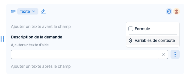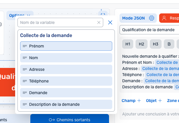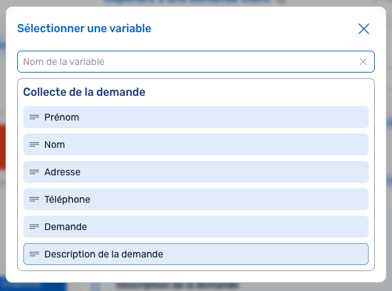 Vous pouvez voir ci-dessus des informations surlignées en bleu, elles représentent ce que nous appelons des "Variables" (car elle varie d'une demande à une autre). Pour les insérer, il suffit de cliquer directement sur la variable que vous voulez afficher.