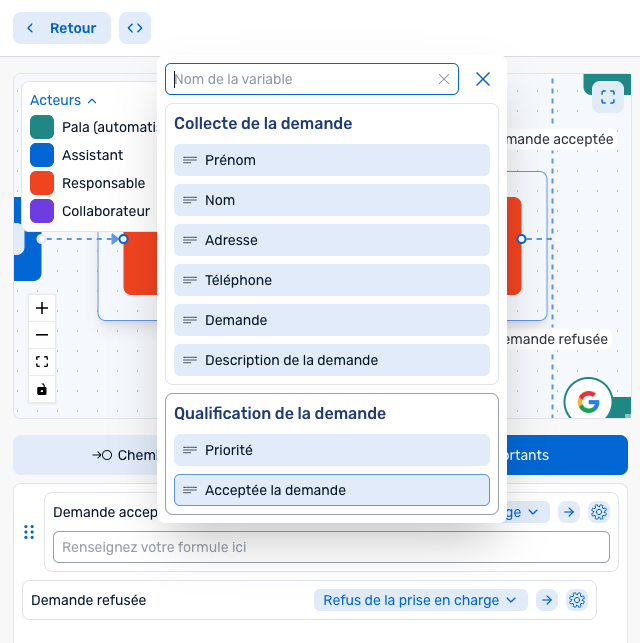 Pour le chemin "Demande acceptée", il suffit de configurer dans le champ "Renseignez votre formule ici". Pour créer la condition : "Champ Acceptée la demande = Oui", il suffit de sélectionner la variable "Acceptée la demande" ! Si vous vouliez créer la condition "Champ Acceptée la demande = Non", il aurait suffit de sélectionner la variable "Acceptée la demande" puis écrire "= false".