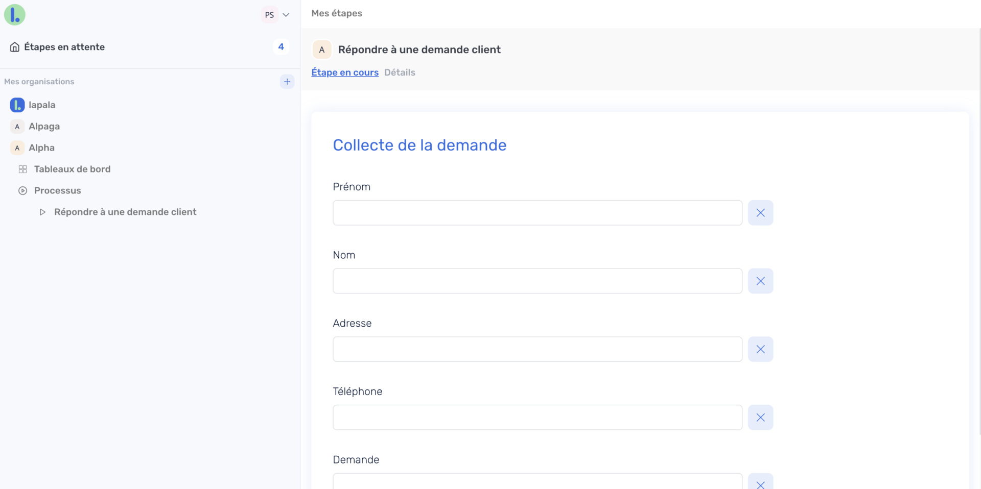 Et ainsi de suite pour toutes les données que vous voulez saisir : Téléphone, Adresse, Demande, Description de la demande ....