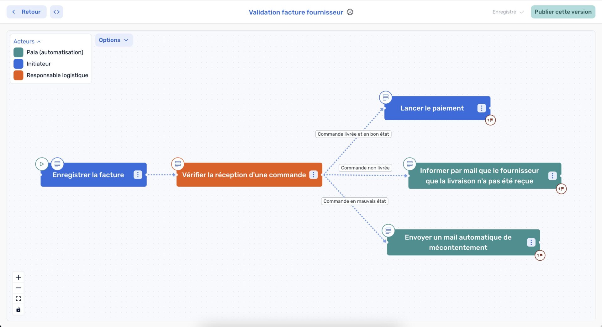 Ce workflow digital de validation d'une facture lié à la vérification de la conformité de la commande permet de gagner en temps de traitement. Cela fortifie la collaboration entre les métiers et la comptabilité. Selon la conformité, différents scénarios liés à des conditions peuvent s'appliquer et faciliter la résolution de problèmes.